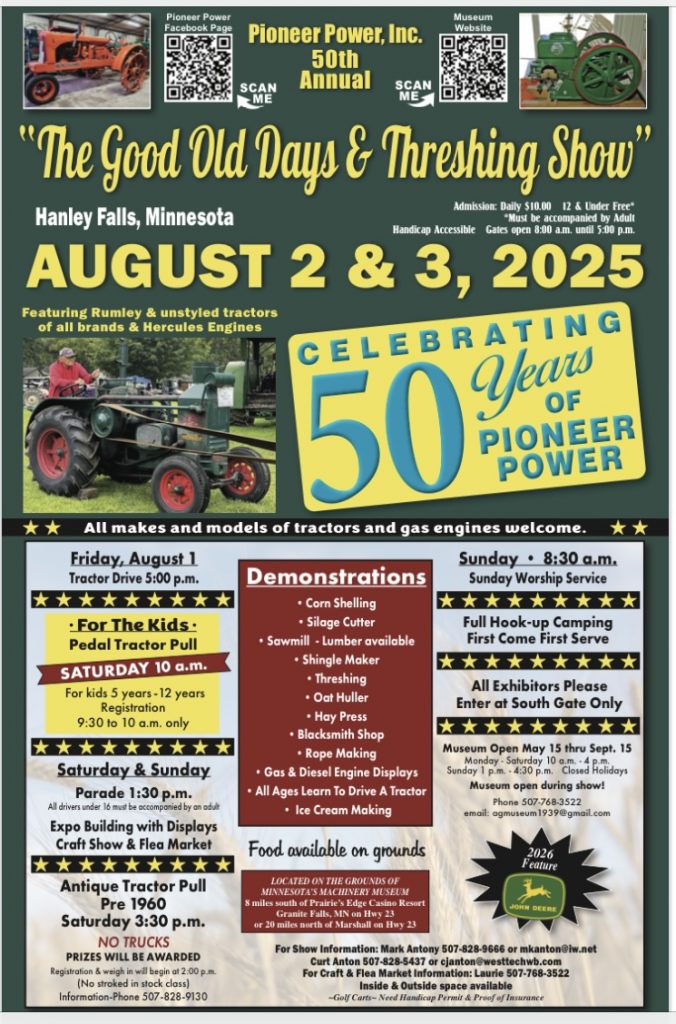 Bring your tractor, gas engine or vintage vehicle. Tractor feature Rumely and Unstyled but all makes welcome – gas engine feature Hercules – bring your gas engine all makes welcome. Church food stand, craft vendors. Join us!