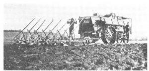 The Sylvester Auto Thresher was introduced in 1907, and was displayed at the Winnipeg Exposition of 1908. It was one of the few such machines designed for both threshing and heavy drawbar work. Most of these rigs had gearing barely heavy enough to move the thresher from one farm to another. Shown here pulling an 8-bottom engine gang, the Sylvester amply demonstrated its drawbar capabilities. Besides the Lindsay, Ontario plant, Sylvester also had branch houses at Brandon, Manitoba and Minneapolis, Minnesota.