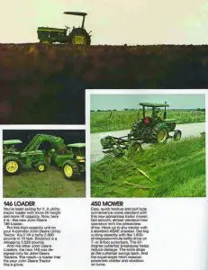 The 146 loader was a popular loader for us; we sold quite a few and in fact, there are still some in the area. We probably sold more of the 145 loader though and later the 143 when the first of the MFWD utility tractors came out. The 143 was the only one that fit these MFWD utilities for a long time. The 350 sickle mower was a better seller for us than the 450, although we sold a few of the 450. It’s fun for me to see some of this equipment again as 1976 was the year we bought our dealership. The ground shot of the utility tractor at the top is nice, too (Photo 11).