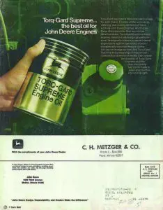 Torq-Gard engine oil is advertised on the back page. Torq-Gard has long been Deere’s engine oil and is still offered today although the Plus-50 ll is Deere’s premiere offering. Over the years, there has been a lot of advertising offered that was associated with Torq-Gard oil and many collectors have a small sub-collection gathered up dealing only with Torq-Gard. I have a few items myself and I remember very well the can shown on this page. Of course, plastic bottles replaced cans and today locating an unopened can is somewhat difficult. They are a sought-after item for a display. There is a version of the oil fill cap shown in this picture that has Torq-Gard oil cast into the metal and these have become collectible also. Pamphlets, hats, signs, oil change stickers and more have all found their way into the hands of collectors.