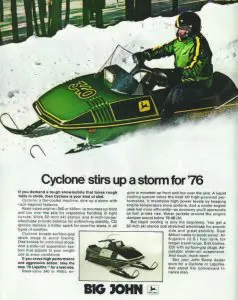 In 1976, Deere was full swing into snowmobiles (Photo 4). Deere introduced them in 1972 and would finally phase them out in 1984 so snowmobiles were still an important item for Deere at this time. The Cyclone was offered with a fan cooled 340 cc or 440 cc engine, but the high performance sled was the liquid cooled Liquifire. These are my personal favorites of all the ones Deere produced. I have several Cyclones and Liquifires from this era. Do they run you ask? Well… next question!